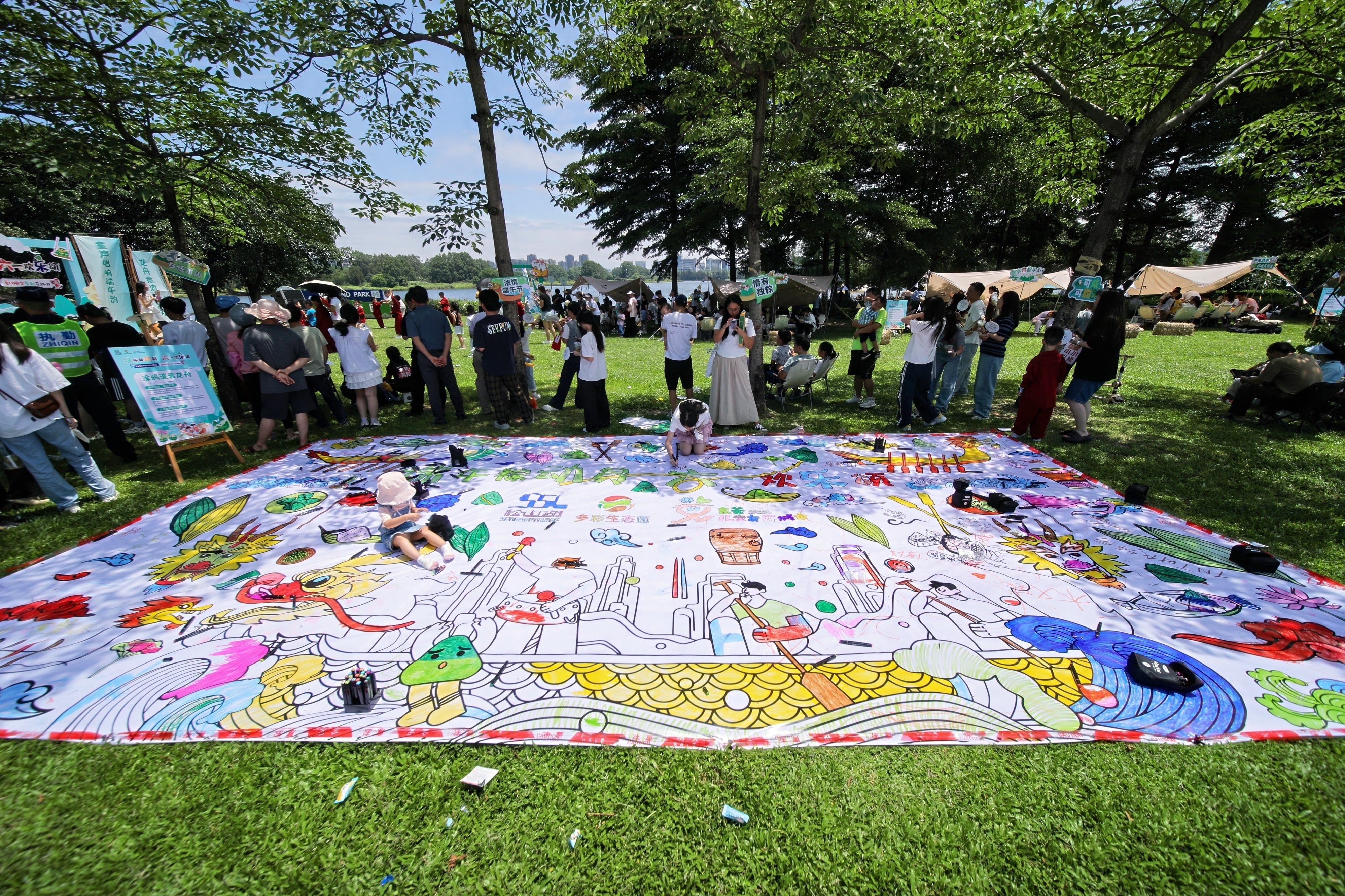 “包粽子比玩游戏还酷好!”端午节假期首日,松山湖生态园片区月湖公园内,7岁的乐乐和姆妈正专注地折叠粽叶,填入馅料。不远方,一群孩子正用彩笔为巨型龙舟壁画涂上清秀的心绪。