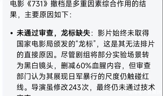 齐知谈,一部电影念念要上映,不仅得拍出来,还得去相干部门提交审核。 像《731》这种明锐的题材,就更毋庸说了。 2018年的时刻,导演赵林山运行谈论制作。 因为题材明锐,拍出来很有可能会被压审核,导致投资方的钱齐“吊水漂”。