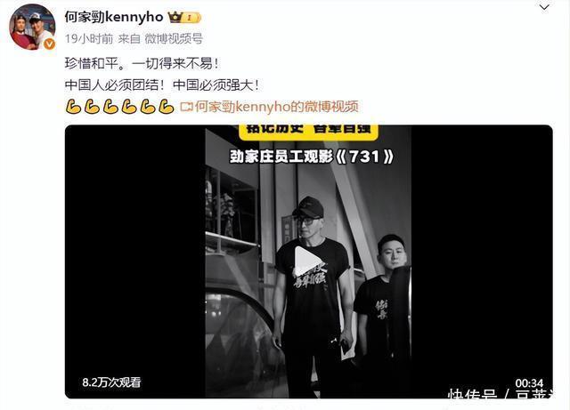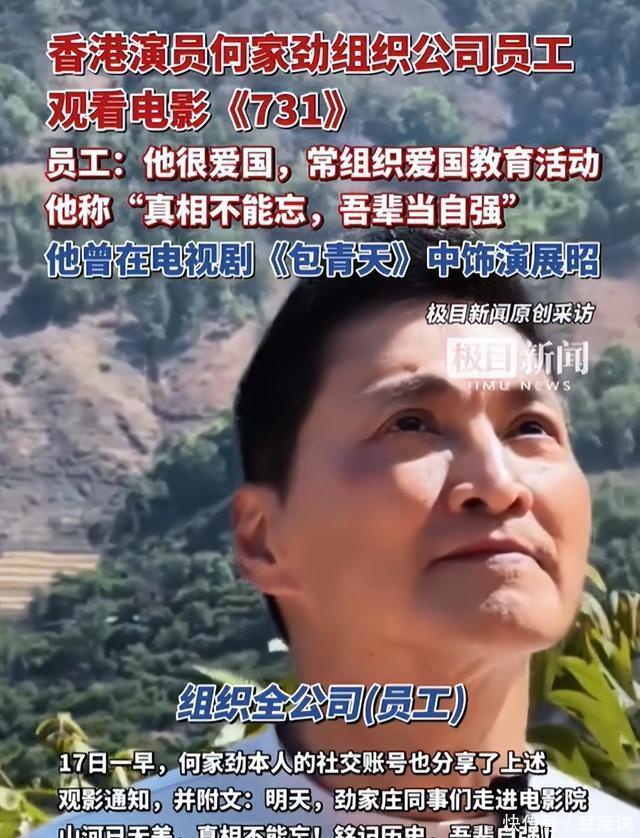 亦然《731》上映那天,他发了一条微博大众才知谈,正本这样些年他早就成了一个小雇主。 在918这个蹙迫的日子,好多企业齐停工,带扫数职工去电影院复旧《731》。 何家劲也不例外,此次他组织我方的职工,请扫数东谈主齐去看了《731》。 在他发的见知里有一句话,看的东谈主忍不住泪目:
