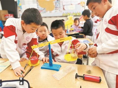 东谈主大附中实验小学学生在作念实验。