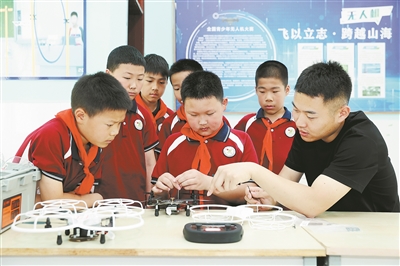江苏省宿迁市洋河新区实验小学师生进行无东谈主机拼装与拆卸维修。